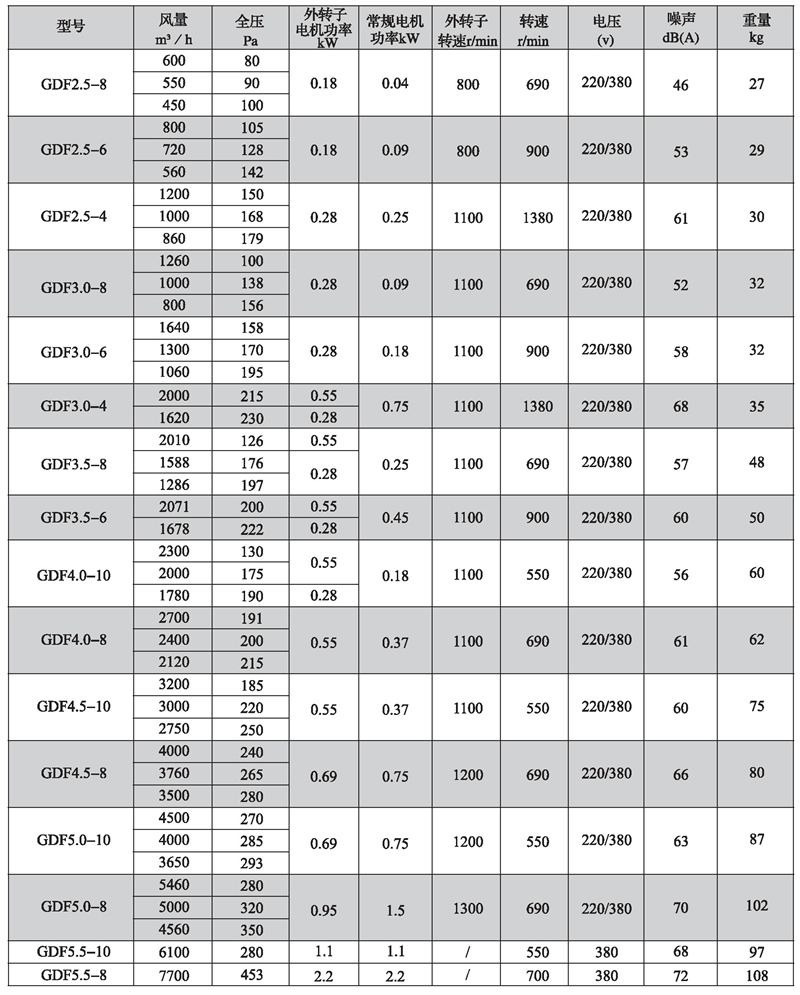 三、GDF系列離心式管道風(fēng)機(jī)性能參數(shù)表