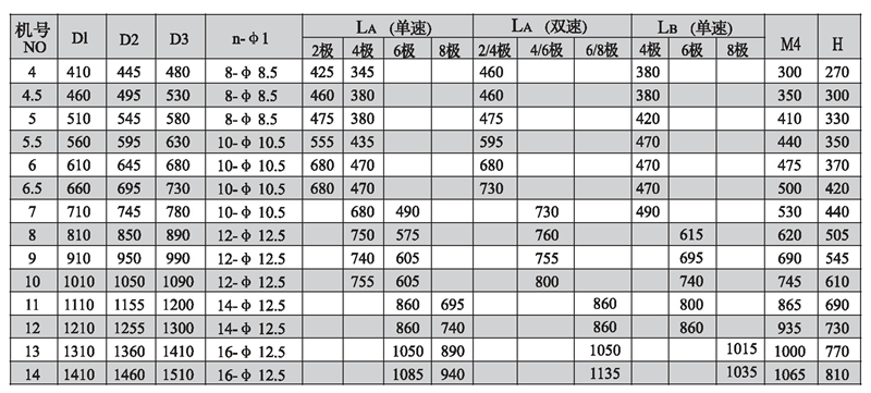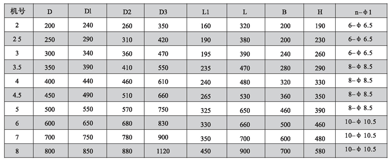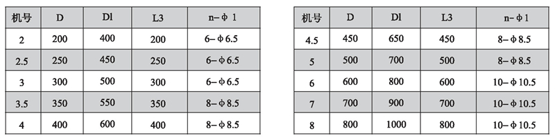 注:風機出廠時法蘭一般不打孔。n-φ1僅供參考,若要打孔請用戶在訂貨時說明.